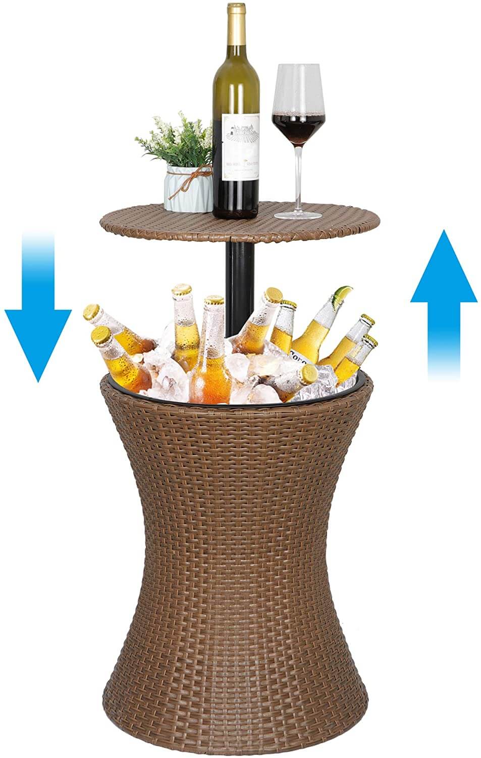 ZENSTYLE Height Adjustable Cool Bar Rattan Style Outdoor Patio Table Designed Cooler All-Weather Wicker Bar Table with Ice Bucket for Party, Pool, Deck, Backyard (Brown)