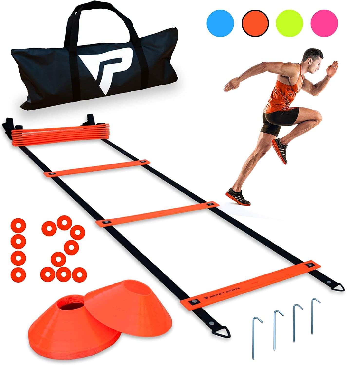 Pro Agility Ladder and Cones - 15 ft Fixed-Rung Speed Ladder with 12 Disc Cones for Soccer, Football, Sports, Exercise, Workout, Footwork Training - Includes 4 Metal Stakes and Heavy Duty Carry Bag